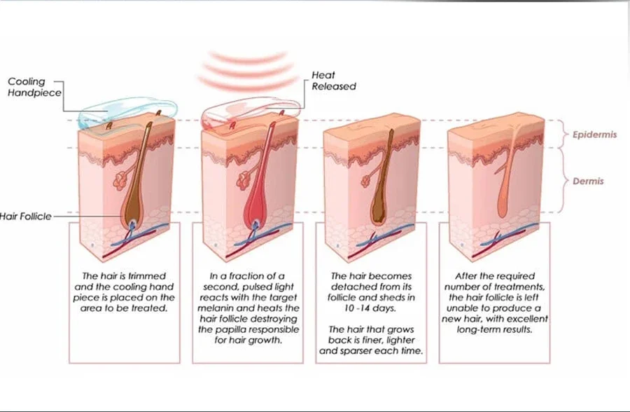 The Diode 808 laser is preferentially using selective light absorption by the melanin of the hair. The light energy is taken up by the hair follicle and converted to heat energy, and minimal energy is transferred to the skin. This preferentially heats the hair while reducing oxygen organization around hair follicle and reducing the chance of hair regrowth. Special cooling technology is applied simultaneously during treatment to cool the skin and protect skin. The Diode 808 laser permanently reduces hair on all skin types, including Fitzpatrick Skin Type Scale I – VI. Treatments are most effective on medium to dark hair on any skin type.